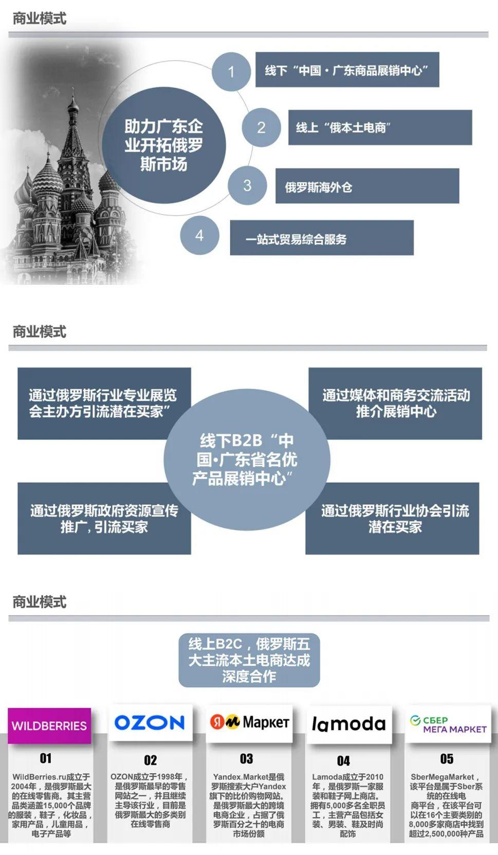 目(mù)前,俄羅斯粵商會已在莫斯科建立總麵積(jī)約 15000 平(píng)米的“俄羅斯(sī)廣東商(shāng)品展(zhǎn)銷中心”,為廣東品(pǐn)牌提供展示及 銷售的渠道和場地,打(dǎ)造廣東產品在俄羅斯的匯集地,並在莫斯(sī)科建立了超 3000 平米“廣東商品海外倉”,對接線上及(jí)線下平台,為企(qǐ)業提供中俄(é)清關(guān)、運輸代(dài)理(lǐ)、倉儲、監管(guǎn)、配送(sòng)等服務,並已幫助超過 200 家各行各業的民(mín) 營企業進入(rù)俄羅(luó)斯市場。